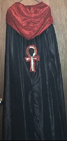 reversible crushed black velvet with burgundy satin.  An appliqued
