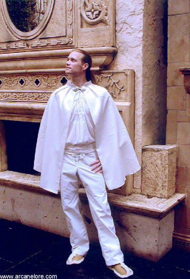 Choose from french Satin or velveteen with satin or brocade/jacquard linings. The cape can be made to be worn clasped at the neck or over the shoulder with cords Elizabethan Style. Optional embroideries are available. This garment is completely customizable. Please inquire with your needs. Cape shown is in White and Candlelight French satin with heavy celtic clasp at the neck. Starting at $155