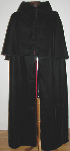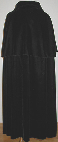 | Velvet or crushed velvet | Velvet lower cape lined in satin with lined shoulder cape | black, burgundy, Celtic green, winter purple, | $650