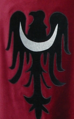 Specials: Accolade Knight tunic in Burgundy Velveteen and bird with moon symbols to front and back and cutwork lower hem ($425) special price $350 other colors are always possible inquire with your needs. heraldic symbols may be