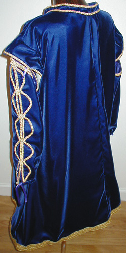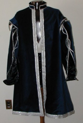 Our elite version is made of the finest cotton Velveteen, Plush or Crushed 100% Rayon Velvet with heavy gold or silver trim, band trimmed collar and slashed hand decorated braided and pearled detachable sleeves that lace under the epaulets. |