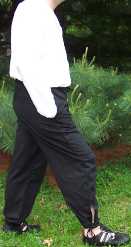 tie them at the knee. Because they are lightweight, they tuck into boots easily. Pockets may not be period but they are useful, so we've added two inconspicuously in the seams on these comfortable trews. Black only. Machine wash, hang to dry. Black Cotton - $45     |
