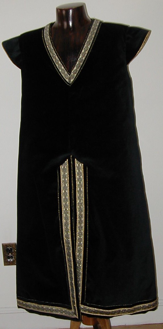 Fully lined surcoat with decorative trim and cording. Surcoat length apx. 47" long Cotton velveteen - $425 Dupioni Silk- $499 Gloves , Sash, Pants and shirt sold separately. Children's sizing also available. Other colors are possible, please inquire with your needs