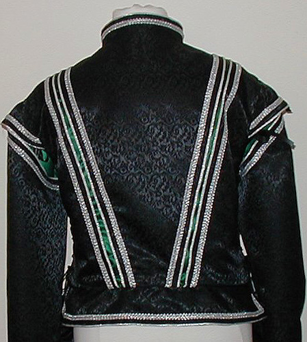 | Elite William Doublet made of Celestial Black Jacquard with silver trim and green slashing. Breeches are made of green satin and celestial jacquard