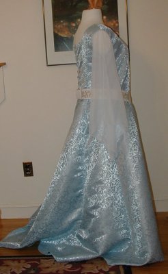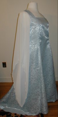 Shown in Ice Blue Romanza Jacquard with white medieval chiffon sleeves and medieval celtic drop belt. |
