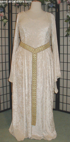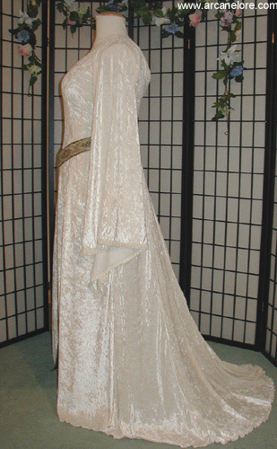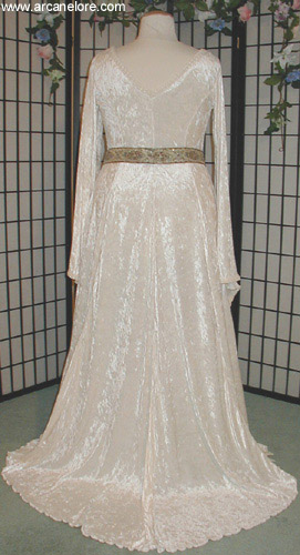 White, Ivory or Candlelight | Sizes A-G by our chart | rich Iced Panne velvet (also known as velour) and features a delicate Celtic style woven braid border at the neckline and sleeves. The back of the gown features a beautiful V back with train |