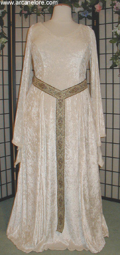 This version is shown in candlelight rich panne velvet and features a delicate Celtic style woven braid border at the neckline and sleeves. The basic gown version shown here comes with a beautiful woven jacquard belting, with options for an artistically embroidered or an appliquéd belts. Gown with jacquard trim belt as shown $399 |
