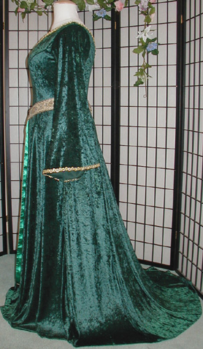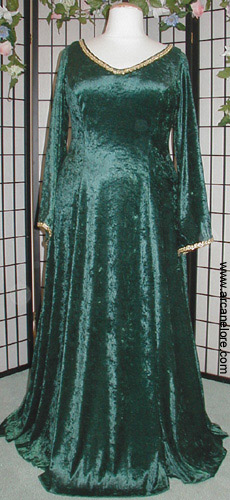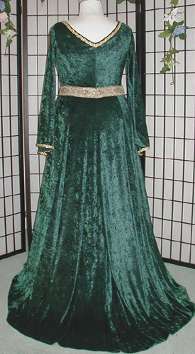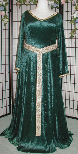 |  | The Lady of Lorian (Elf maiden) Shown here in an exquisitely rich forest fir green stretch velvet called Iced Panne the gown is carefully hand trimmed at the neck and sleeves in a delicate fairy scroll in gold or silver with a contrasting jacquard belt. Chapel train The Lorian gown is truly beautiful and compliments ladies of all sizes. Please see our size chart below. (specialty sizing is available please inquire). Please order sizes by our chart (NOT your store bought clothing size) Lorian Gown $399
