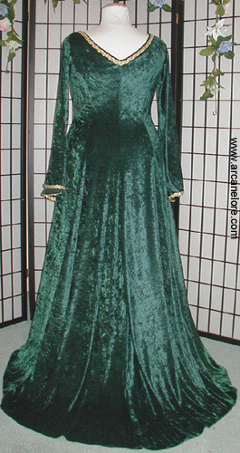 The Lady of Lorian (Elf maiden) Shown here in an exquisitely rich forest fir green stretch velvet called Iced Panne the gown is carefully hand trimmed at the neck and sleeves in a delicate fairy scroll in gold or silver with a contrasting jacquard belt. Chapel train The Lorian gown is truly beautiful and compliments ladies of all sizes. Please see our size chart below. (specialty sizing is available please inquire). Please order sizes by our chart (NOT your store bought clothing size) Lorian Gown $399
