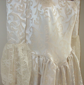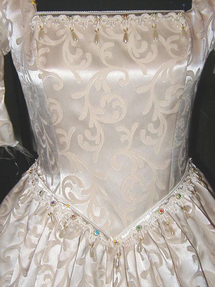 You'll feel like you're stepping into a dangerous liaison when you don this dress! The squared neckline of the bodice is exquisitely outlined in colored stones and dropped pearl beading. The lines of the gown conform to your shape to give you the erotically aristocratic look of 18th century France. With a flutter of dark lashes behind your fan you can view the festivities from your balcony seat, or entangle yourself with your paramour on the dance floor while you enchant all who pass! We've added even more beading along the drop waist for delicate definition and eye catching appeal. You will win the hearts and rapt attention of all at your most memorable of gatherings while you saunter in this latest lovely creation from Madame Kyri! Please contact her for information and guidance on fabric choices and trimmings to compliment your skin tone, endowments, and your delightfully feminine form.....A joining of hands in marriage could never be more memorable!